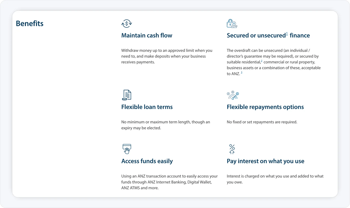 ANZ Bank allows you to manage your cash flow with an ANZ Business Overdraft, a flexible, revolving line of credit that allows you to access additional funds up to an approved limit when you need them.