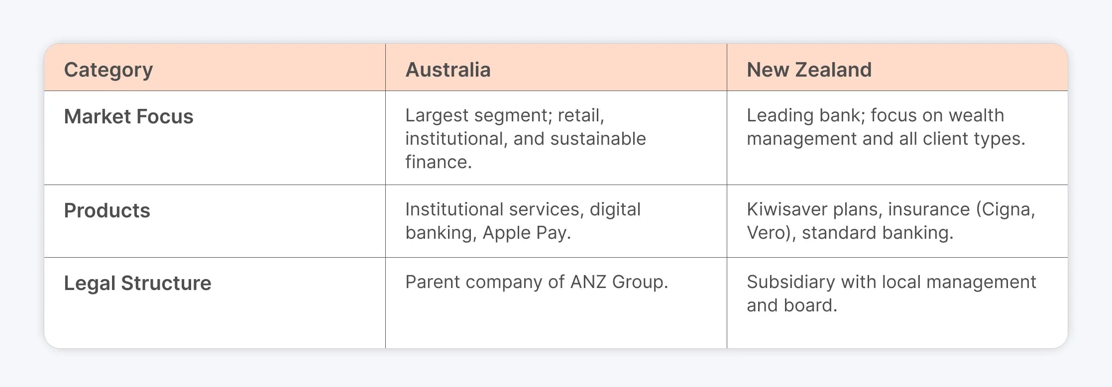 ⚫ New Zealand - Through alliances with companies like Cigna and Vero, ANZ New Zealand focuses on Kiwisaver retirement plans and insurance products in addition to normal banking services.