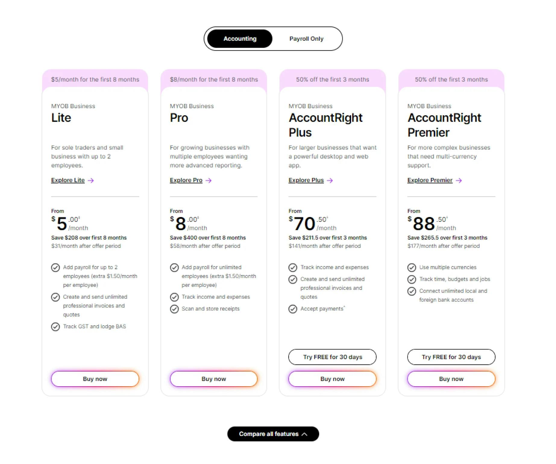 Myob offers 4 different pricing plans tailored to various business sizes and needs.