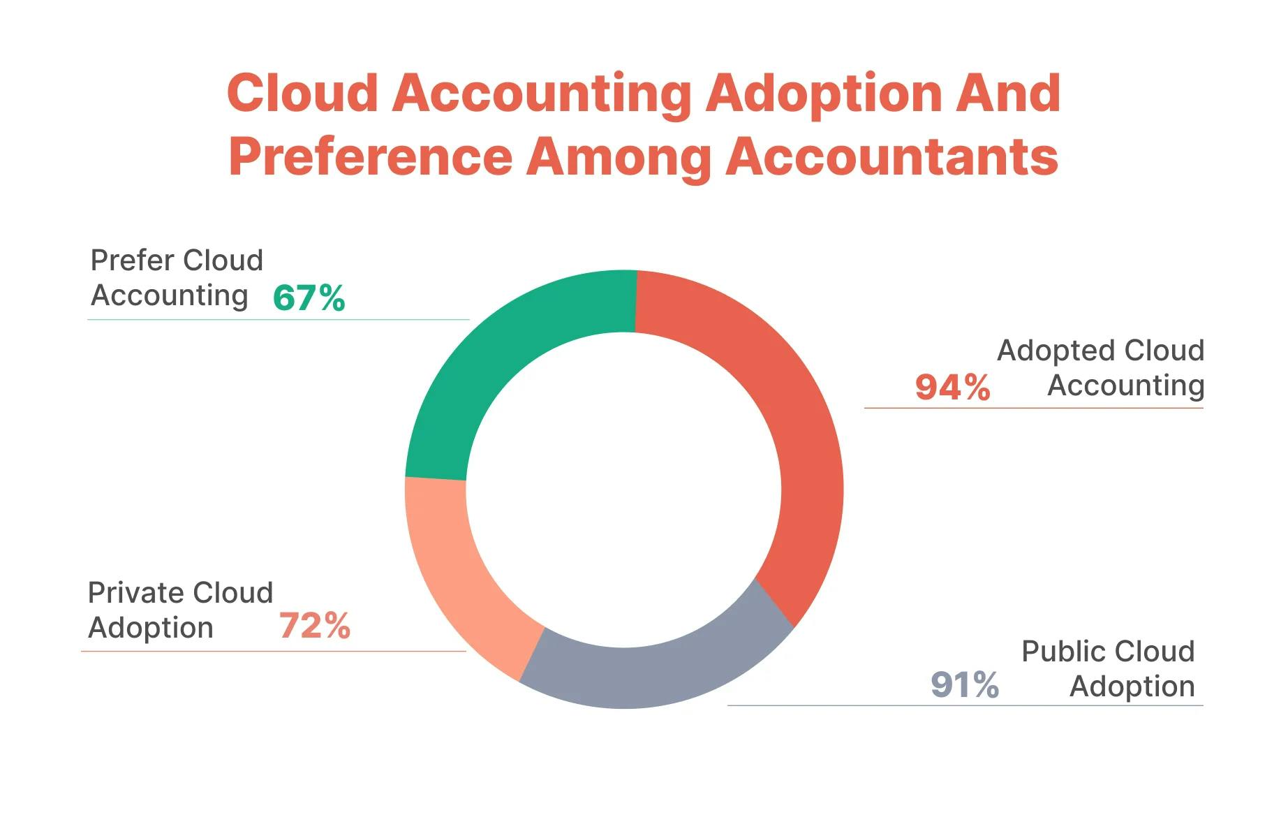 The public cloud adoption rate stands at 91%, while the private cloud adoption rate is 72%. Furthermore, 67% of accountants prefer cloud accounting to traditional solutions.