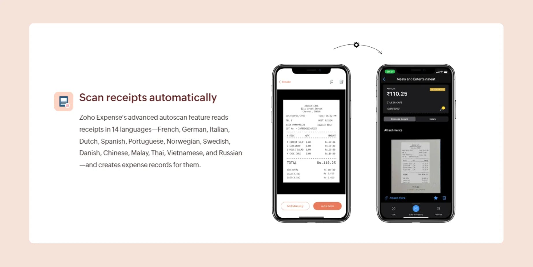 1. Use Advanced Autoscan: Zoho Expense’s advanced autoscan can read receipts in 14 languages, such as French, German, Italian, and Spanish, and automatically generate expense records.