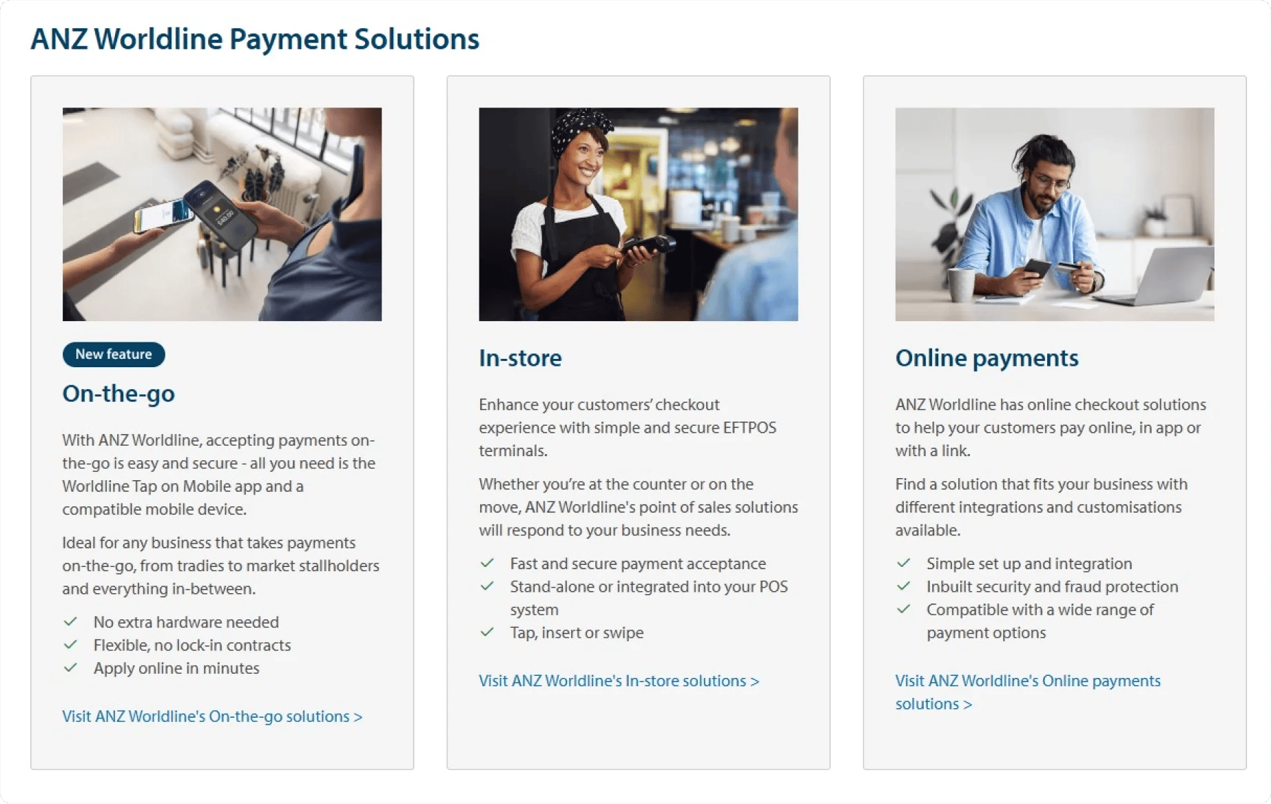 - Online Payments: ANZ Worldline’s solutions enable businesses to accept payments via website, app, or custom links with inbuilt security and fraud protection.