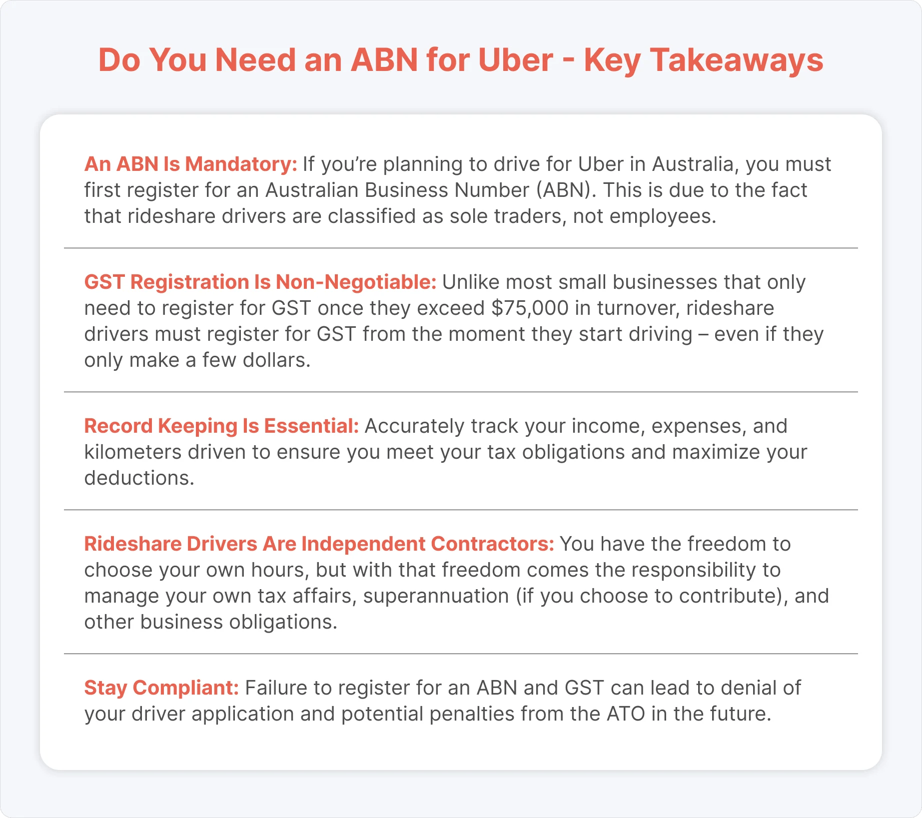 An ABN is crucial for properly issuing or recognising any invoices or payment records, especially if you ever decide to use additional ridesharing or delivery platforms.