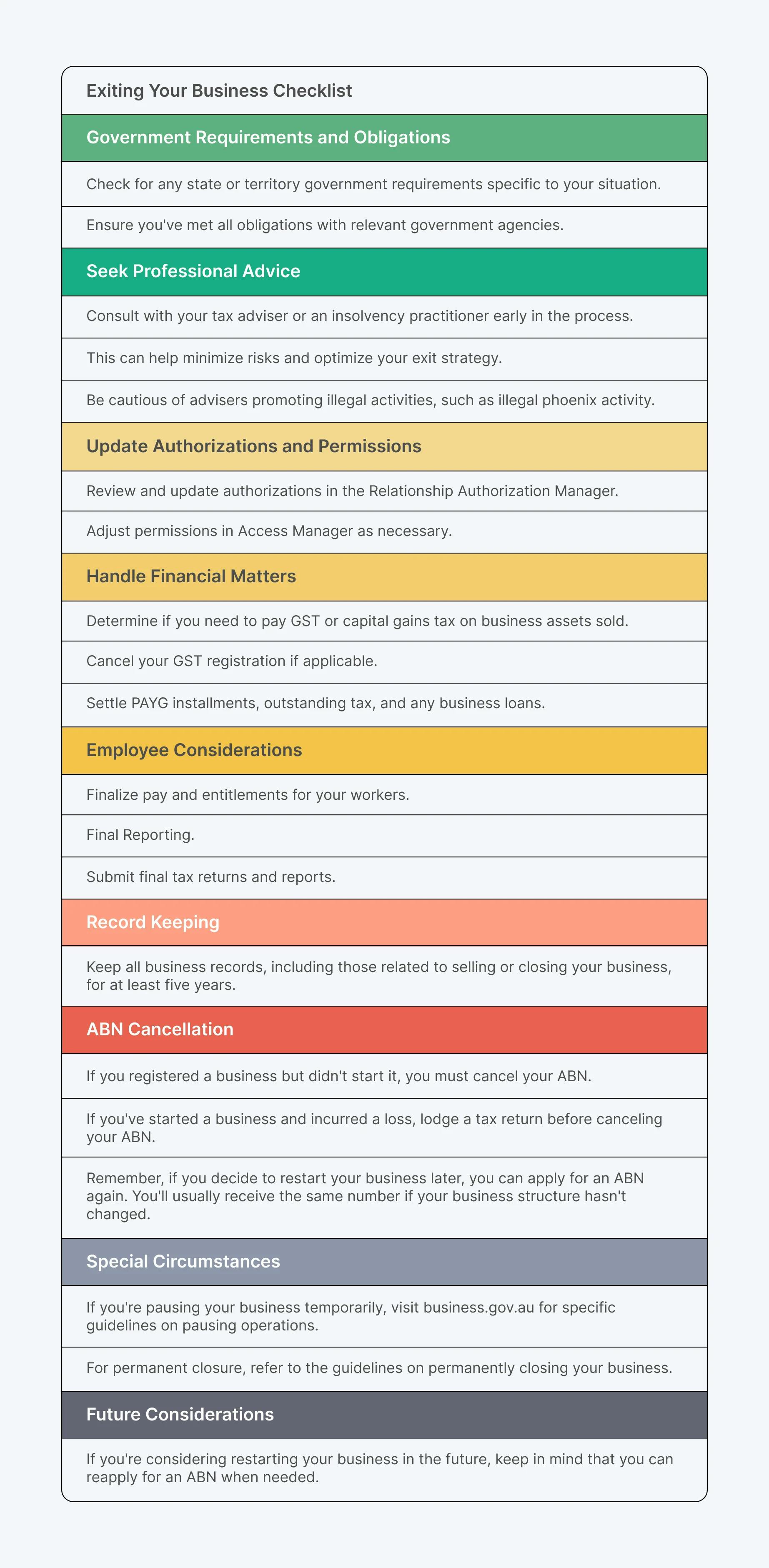 We'll also help you recognize when it's time to cancel your ABN and provide a comprehensive exit checklist to ensure a smooth transition.