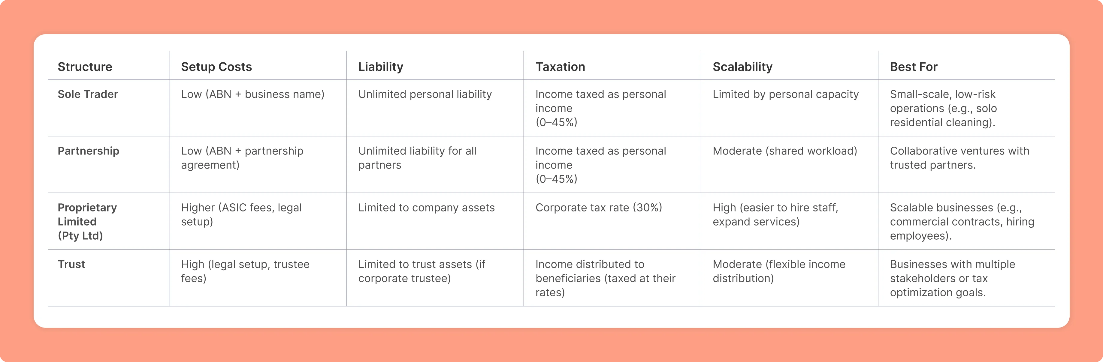 Australia offers several business structures, although sole traders and proprietary limited companies (Pty Ltd) are the most frequent for cleaning businesses.