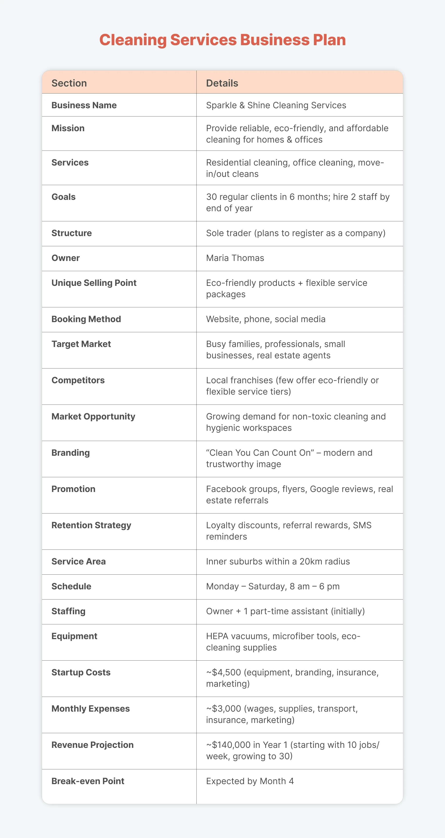 When it comes to equipment and supplies, it is best to start with the basics and expand later. In the beginning, it is enough to have a vacuum cleaner, mop, rags and cleaning products, but as your business grows, consider switching to eco-friendly variants.