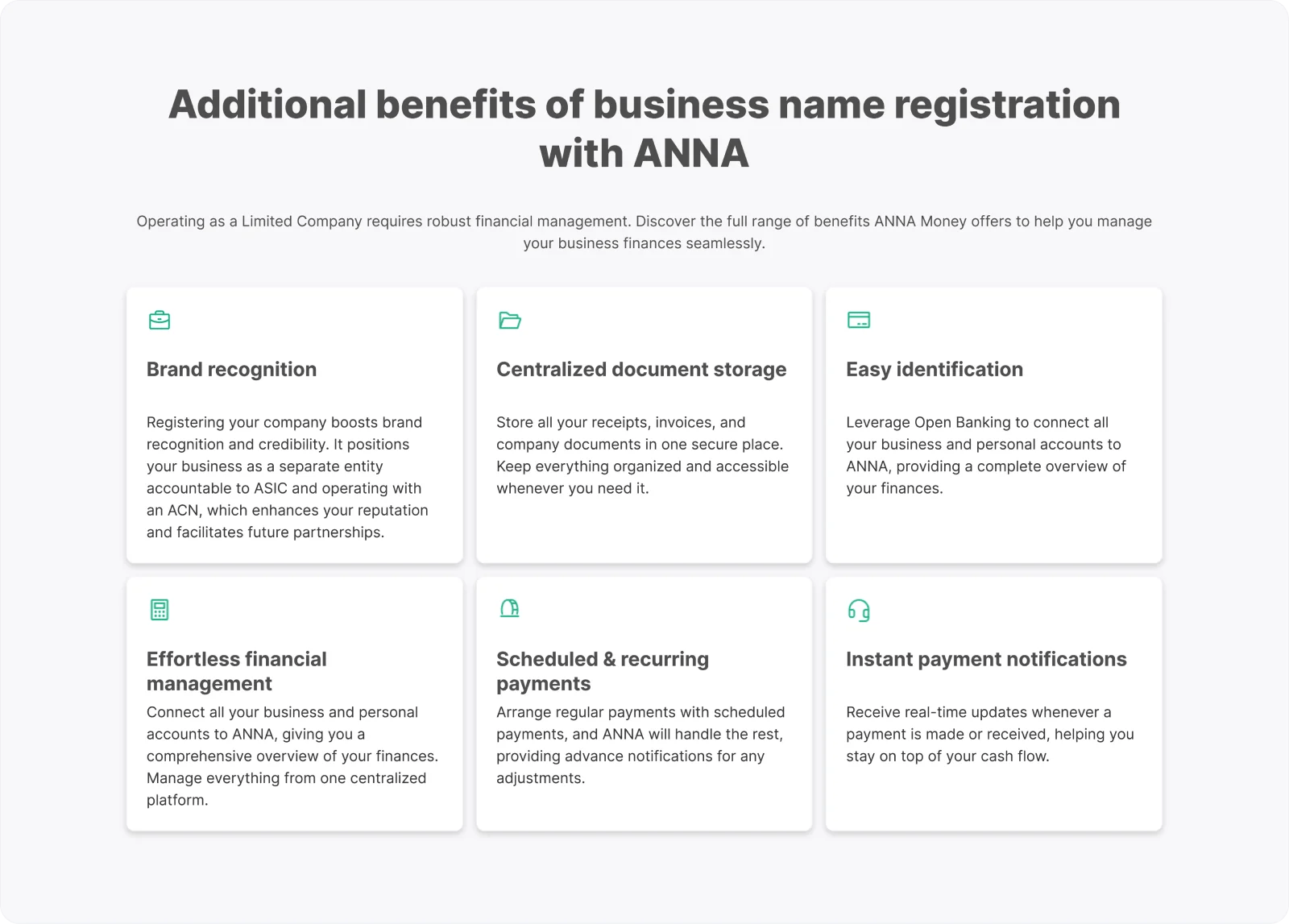 With ANNA, you don’t just register a business name, you get a fully integrated business account that handles: