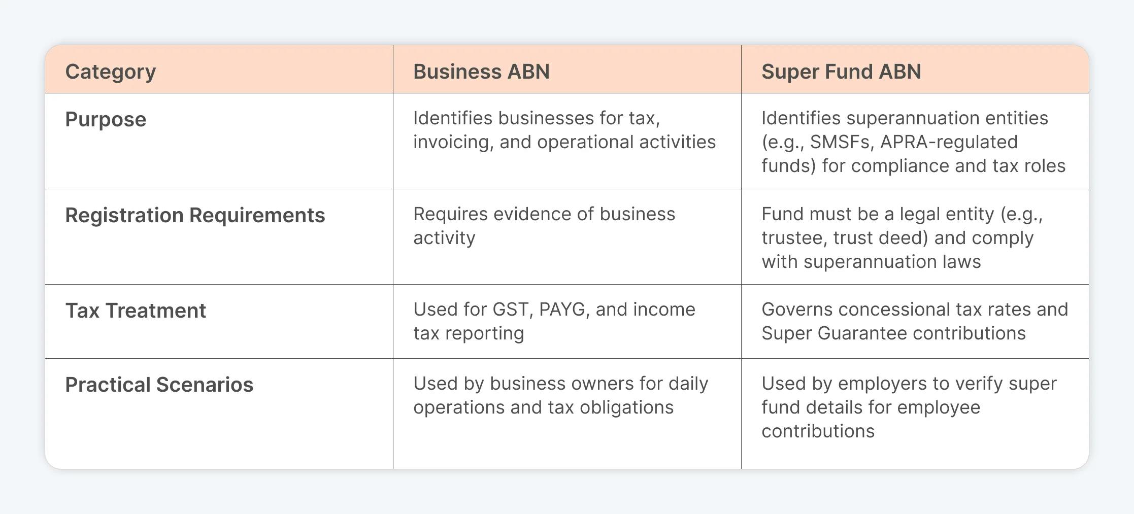 Here's a detailed breakdown of the differences between a business ABN and a super fund ABN: